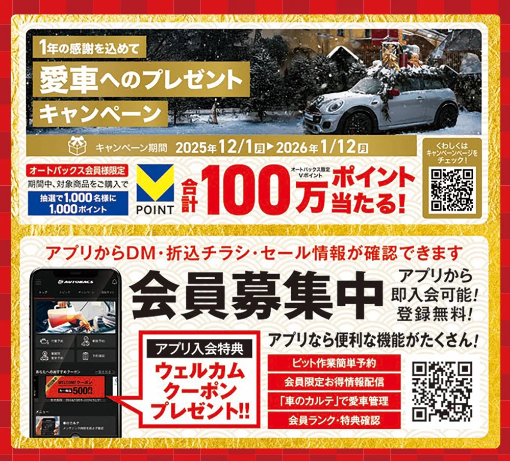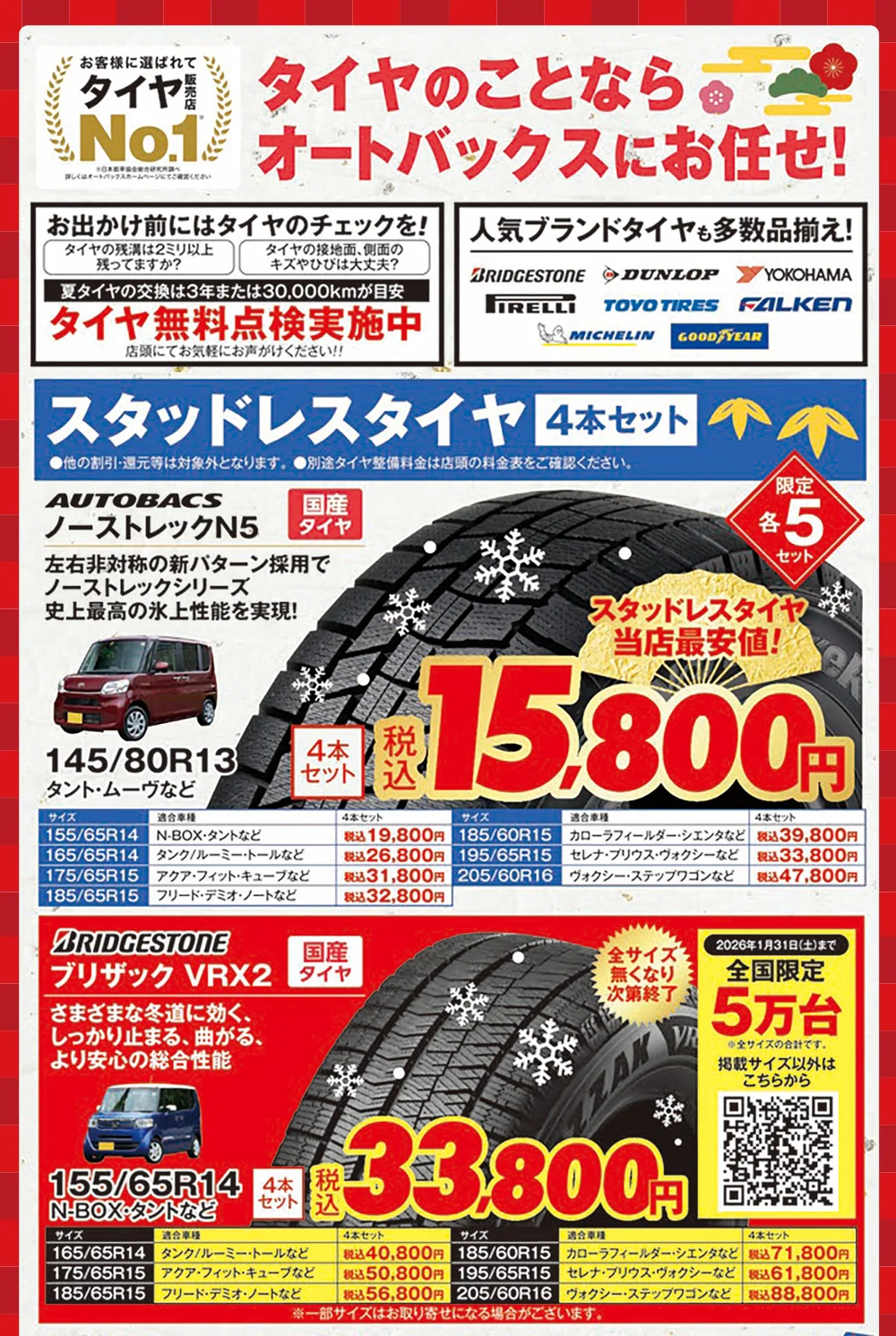 新しい年も全力で快適&楽しいカーライフを応援!お得がいっぱいの初売りセール「オートバックス新春初売り」を、オートバックスで2026年1月3日(土)から2026年1月12日(月・祝)まで実施します。