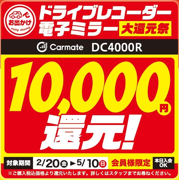 ドライブレコーダー・電子ミラー大還元祭の対象商品の一例です。前後2カメラタイプ・全方位複数カメラタイプ・電子ミラー[デジタルミラー]タイプなどを還元対象としてご用意しています、是非店舗でお確かめください。