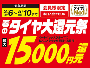 2026年 春のタイヤ大還元祭 – オートバックスはタイヤが安い!サイズに応じて最大15,000円還元