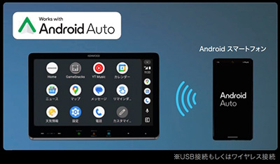 ワイヤレス接続でAndroid™ の スマホアプリをナビの大画面で使える!音楽や電話/メッセージ/マップなど対応しているスマホアプリをナビで利用できます。しかもワイヤレス対応なので配線が不要。音声認識を使ってマイクに話しかけることで、前を向いたまま目的地設定や好きな音楽を選曲して聴いたり、かけたい相手に電話もできます。USBケーブルによる有線接続にも対応しています。