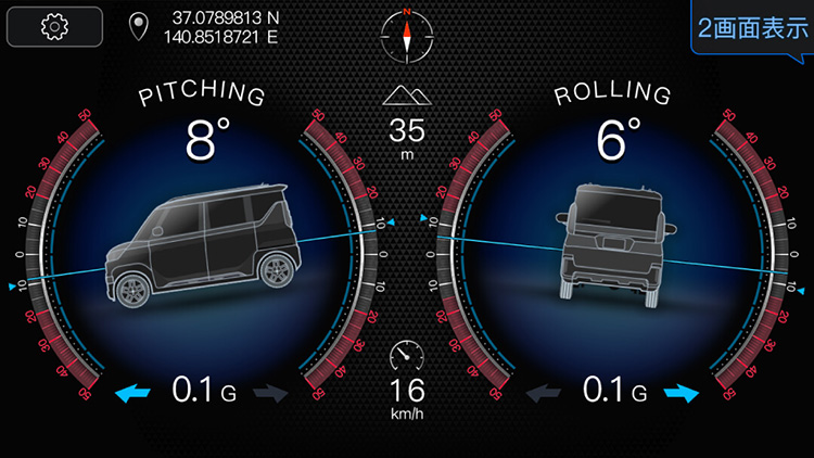 フロントフェイスとサウンドで演出する新型デリカミニ専用オープニングと、運転をもっと楽しくする新型デリカミニ専用のデジタルクリノメーター[傾斜計機能]も格納。