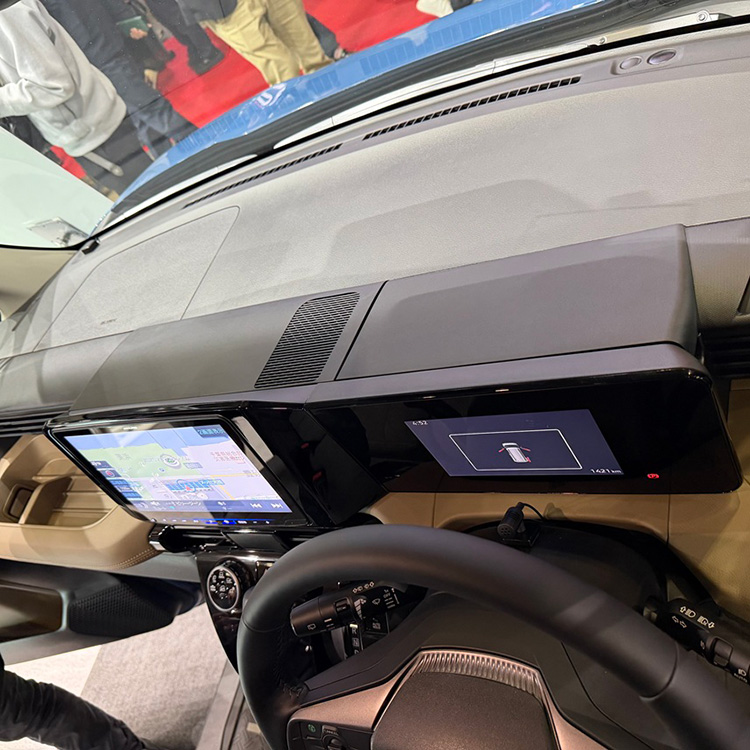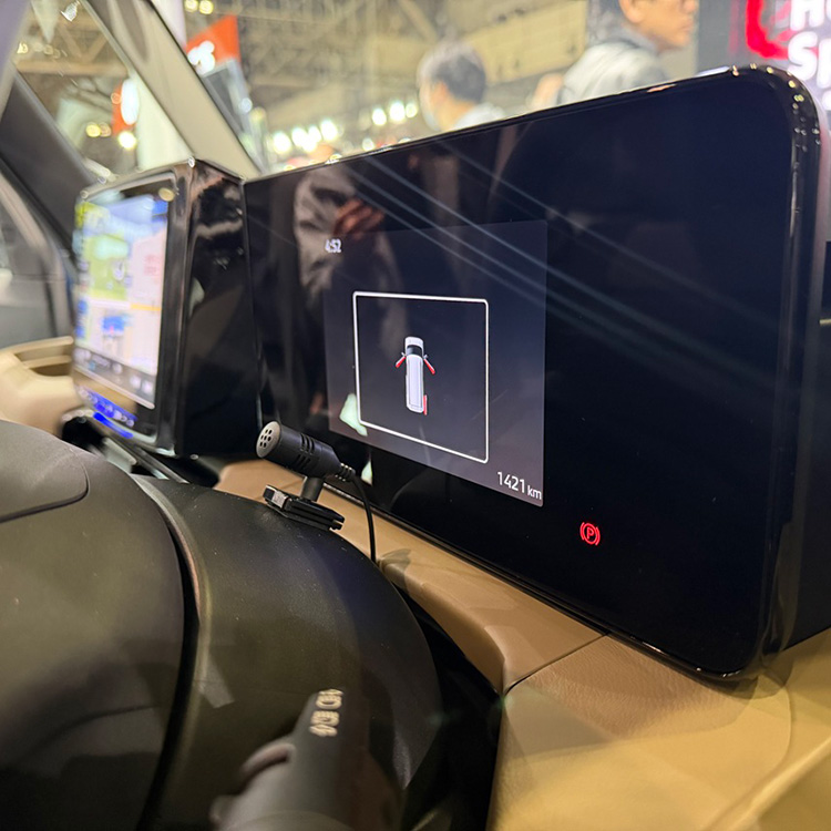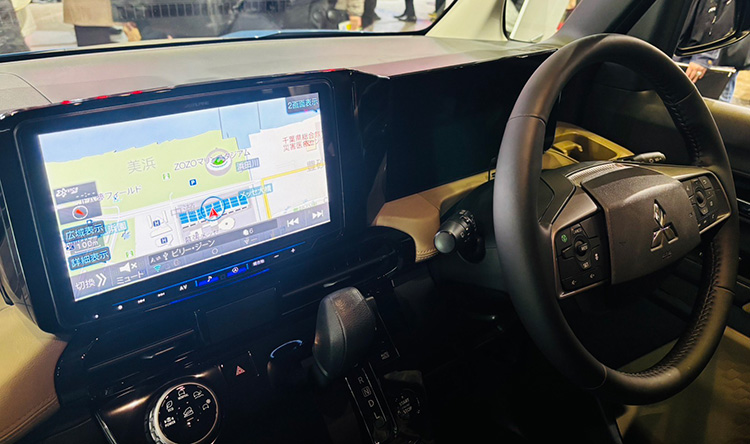 新型デリカミニのダッシュボードと一体化する滑らかなデザインを実現。11型大画面を美しく装着します。また12度の傾斜を画面につけることで見やすさや操作感を向上させます。