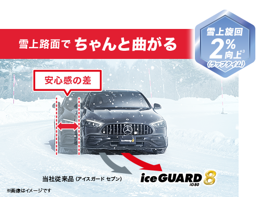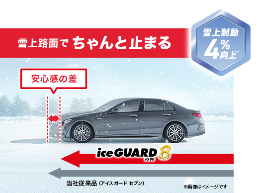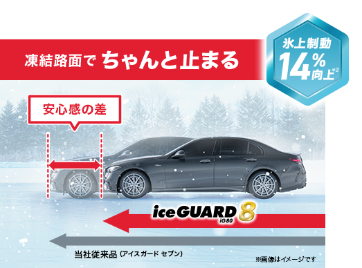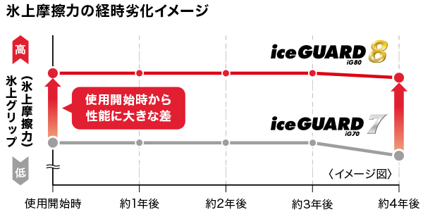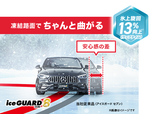 コンパウンドの柔らかさを維持することで“より永く効く”性能を発揮。アイスガード セブンを上回る氷上性能を、より永く楽しむことができます。