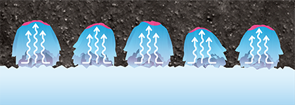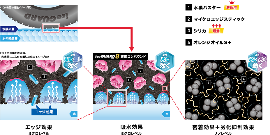 配合密度を最大化させた新採用の吸水素材「水膜バスター」。バラの花のような多層構造による毛細管現象によって、氷の上で滑る原因となる水の膜を強力に吸水。さらに高密度化で剛性を上げることで接地形状を維持しタイヤが氷に密着。吸水と密着、2つの効果で氷の上でも高い安全性を発揮します。