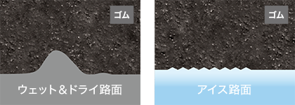 冬の路面[氷]にピタ[接触]っと密着 – 新開発のコンパウンド「冬ピタ吸水ゴム」