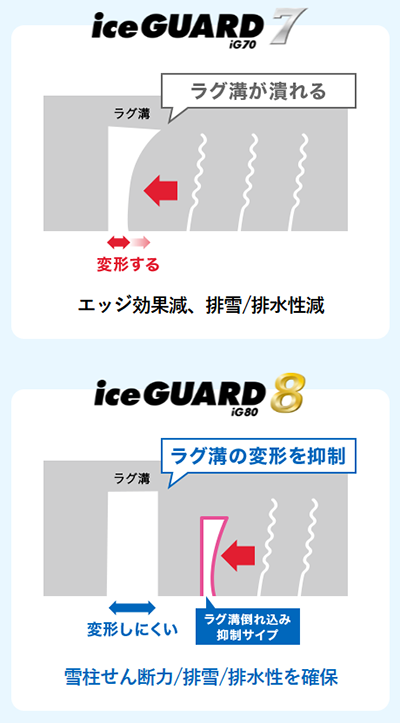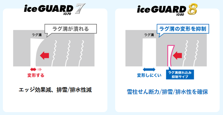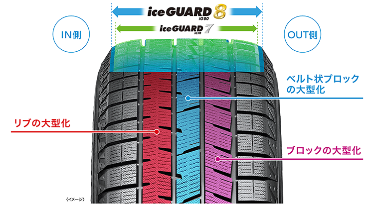 トレッド幅の拡大により実接地面積を8%増加させ、リブとブロックの大型化でブロック剛性を7%増加を達成。アイスガード史上最高の氷上性能を実現しました。