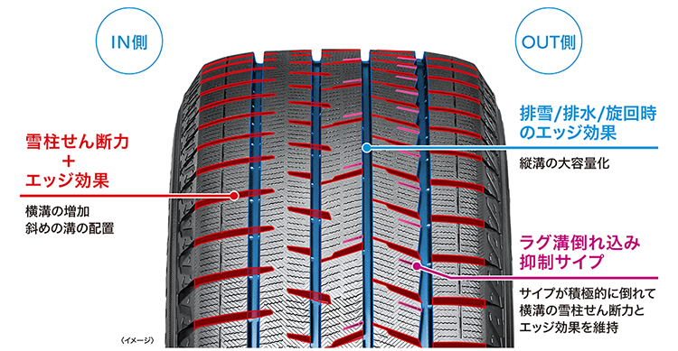 潰れやすい形状のサイプを敢えてラグ溝近くに配置。ラグ溝の代わりに潰れることでラグ溝の変形を抑制し、雪柱せん断力/排雪/排水性を確保します。